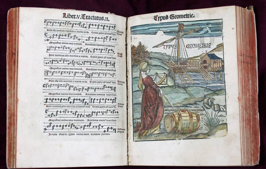 Most fields of sciences are preceded by a full page, metaphorical woodcut, showing and representing the field of science to be discussed. In this 1512 edition after the 12 chapters comes a detailed index and an important Appendix on Greek and Hebraic languages, on the Astrolabe and geographical composition; perspective and other issues.